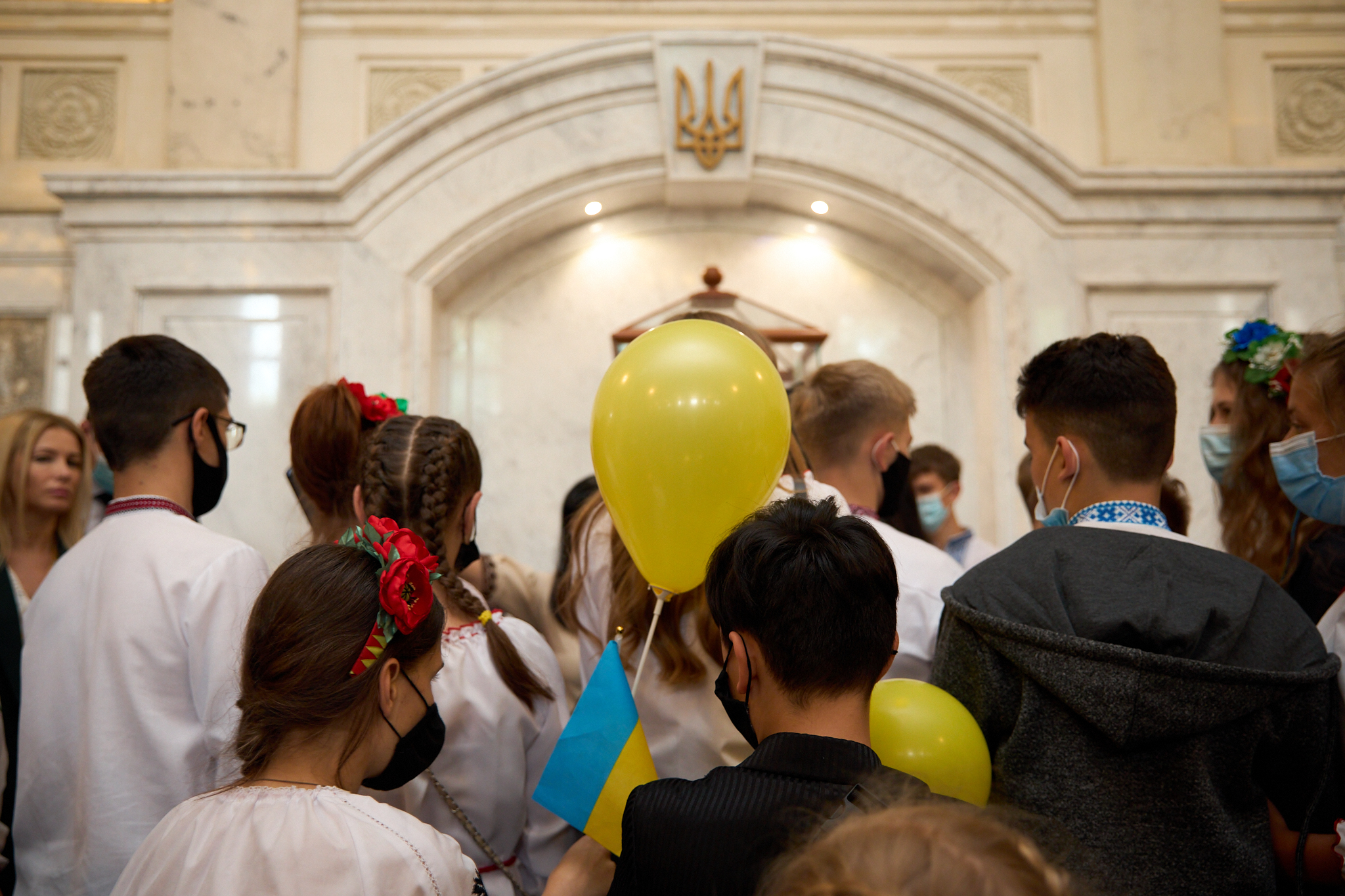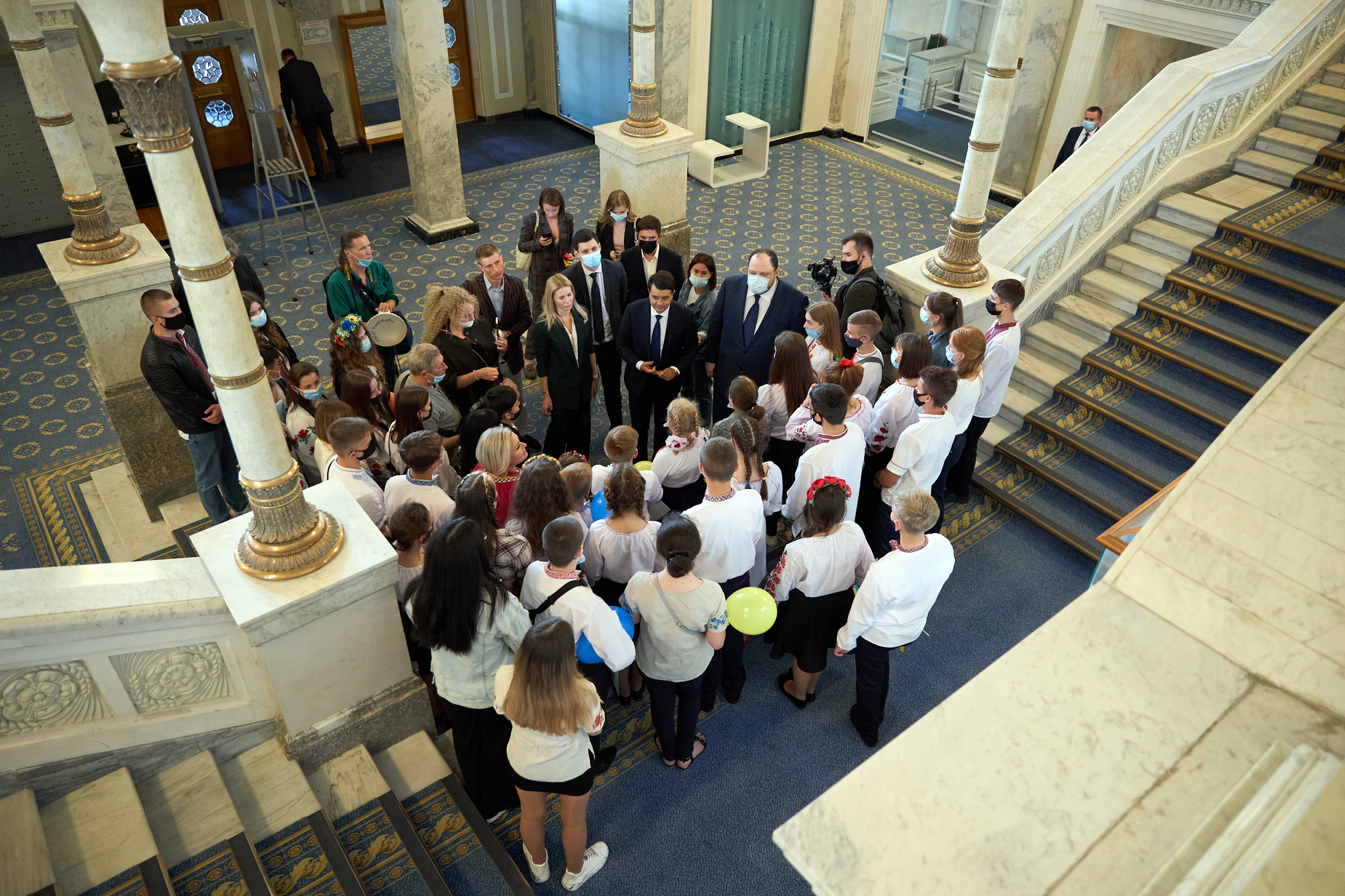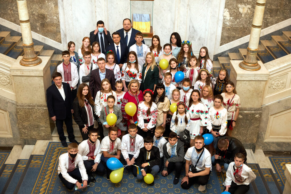 Народні депутати від «Слуги Народу» Юлія Гришина та Роман Грищук, Голова парламенту Дмитро Разумков та його перший заступник Руслан Стефанчук провели екскурсію Верховною Радою для 50-ти дітей із прифронтових територій і дітей загиблих героїв.