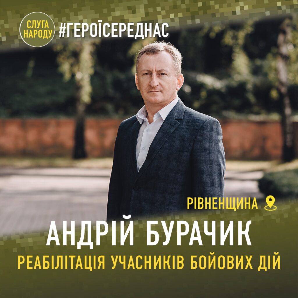 Андрій Бурачик, депутат Рівненської обласної ради партії «Слуга Народу» та військовий лікар, під час повномасштабної війни надає допомогу з відновлення учасникам бойових дій в умовах госпіталю.