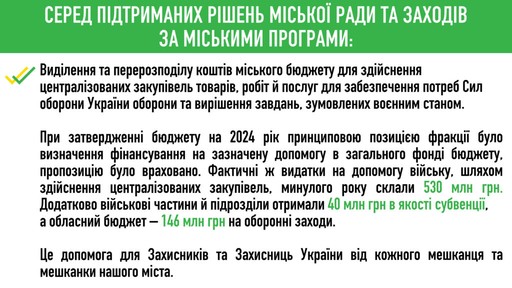 Життя міста в час повномасштабної війни – до необхідності розв’язання «класичних» проблем, як-то житлово-комунальне господарство, транспорт чи підтримка закладів освіти й медицини, доєдналась велика комплексна задача – робити все, щоб підтримати Україну у війні та всіх українців, які борються за незалежність або постраждали від бойових дій. Протягом 2024 року депутати від «Слуги Народу» продовжили дотримуватись вектору, заданого ще у 2022 році.