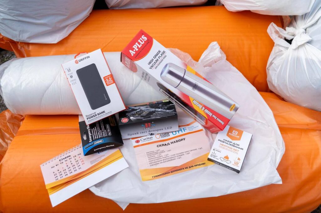 До наборів входять спальні мішки, павербанки, термоковдри, ліхтарики, термоси, переносні плити з пальниками.