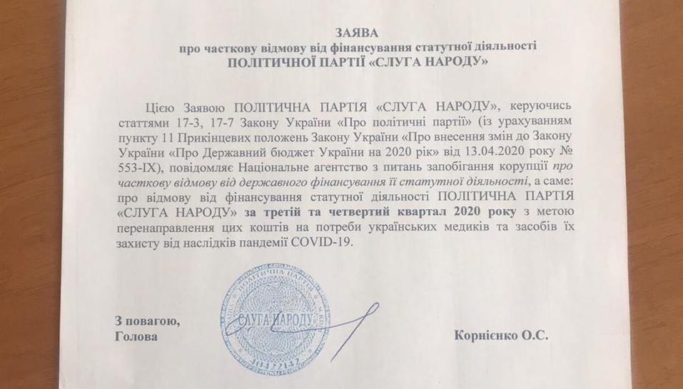 «Слуга Народу» переспрямує бюджетне фінансування за 3 і 4 квартали 2020 року на потреби українських медиків та подолання наслідків пандемії COVID-19. Голова партії Олександр Корнієнко підписав відповідний лист, який сьогодні передали і зареєстрували в НАЗК.