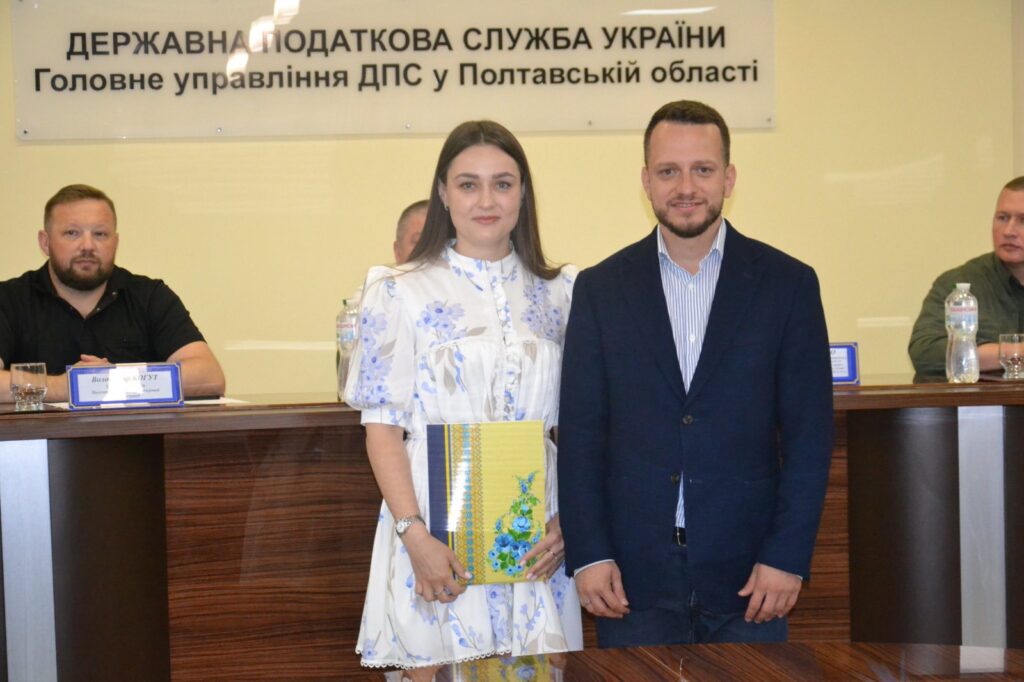 Олег Хардін передав відзнаку Полтавської обласної ради виконувачу обов’язків начальника Головного управління ДПС у Полтавській області Сергію Левченку, а також працівникам служби, які нині боронять Україну в лавах Збройних Сил.