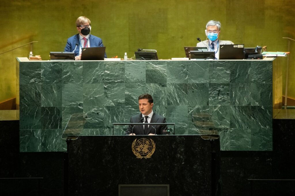 Зеленський «потролив» виступ російського президента Володимира Путіна на Мюнхенській конференції 2007 року. Він підкреслив, що російський клептократично-КГБ-шний режим, використовуючи правильну риторику про багатосторонність у міжнародних відносинах та критикуючи «право сили», скористався часом, щоб у багатьох питаннях брати в заручники і зводити нанівець ефективність ООН. І не лише зловживаючи правом вето, як постійний член Ради безпеки, а й викручуючи руки і державам-членам, і секретаріату ООН.