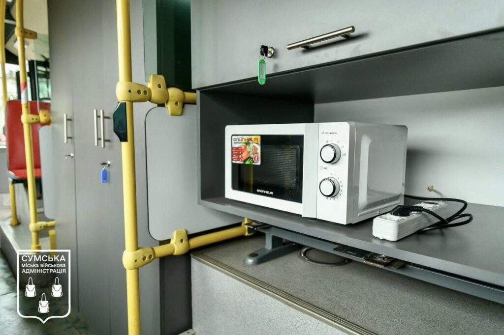 Перший автобус уже повністю готовий до роботи, другий — на завершальному етапі дообладнання, ще три перебувають у резерві. Всередині — 50 розеток, інтернет-роутер, електрочайник, мікрохвильова піч, кулер із питною водою, аптечки, ковдри та одноразовий посуд. Тут можна зігрітися, зарядити телефон, скористатися інтернетом і отримати гарячий напій або сухий пайок.