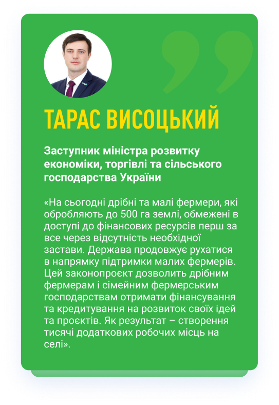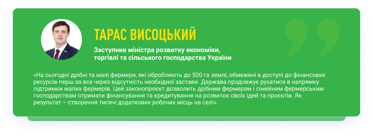 Запускає створення Фонду часткового гарантування кредитів у сільському господарстві. Зараз дрібні фермери позбавлені можливості інвестувати у господарство: